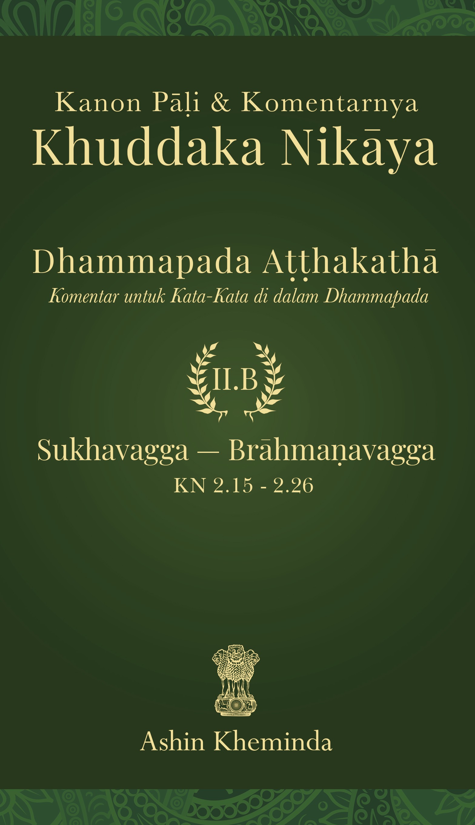 Sinopsis: Buku Dhammapada Aṭṭhakathā (II.B) berisi penjelasan dari Sukhavagga hingga Brāhmaṇavagga (stanza 197–423), melengkapi keseluruhan 26 Vagga dengan 423 stanza. Buku ini tidak hanya menyajikan syair-syair Dhamma, tetapi juga penjelasan istilah dan kisah latar dari Aṭṭhakathā sehingga pembaca dapat memahami makna yang lebih dalam. Setiap Vagga dijabarkan secara sistematis, mulai dari Kelompok Stanza tentang Kebahagiaan (Sukhavagga) hingga Kelompok Stanza tentang Para Brāhmaṇa (Brāhmaṇavagga), sehingga pembaca mendapatkan gambaran yang utuh mengenai isi kitab ini.